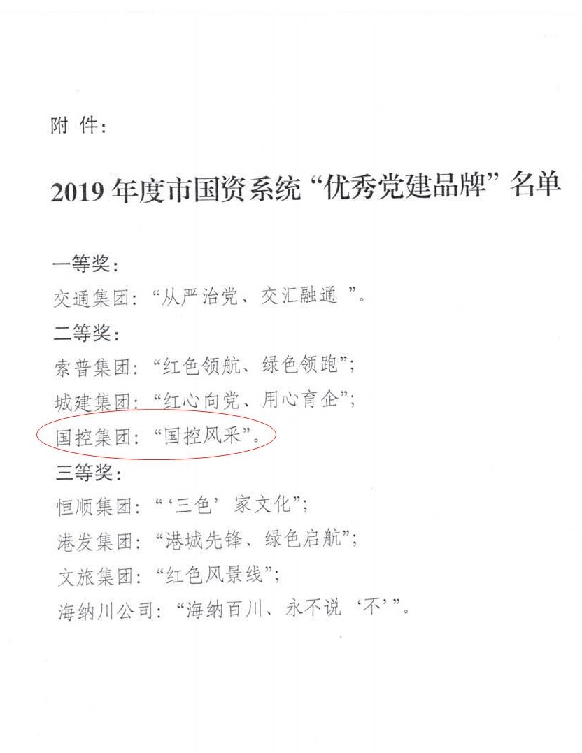 国控集团“国控风采”党建品牌荣获2019年度市国资系统“优秀党建品牌”二等奖
