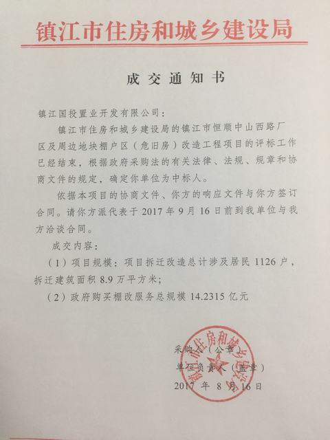 近日,镇江市住房和城乡建设局与市国控集团对镇江市恒顺中山西路厂区及周边地块棚户区(危旧房)改造工程项目政府购买服务进行签约。这是镇江市首次对棚户区改造采用政府