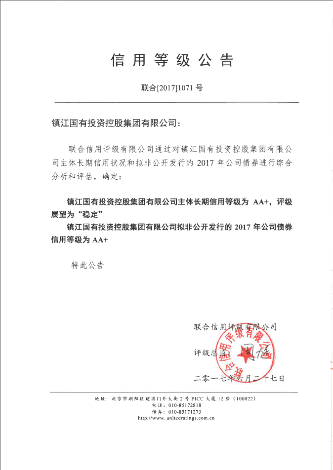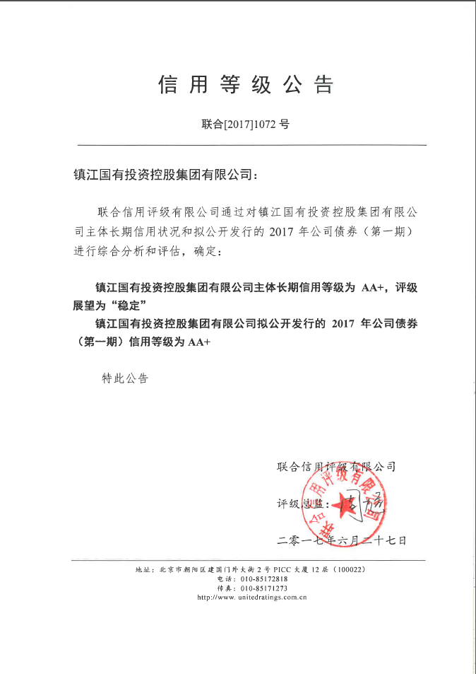 近日,镇江国控集团获得由联合信用评级有限公司出具的《2017年发行公司债券信用评级报告》,信用登记AA+,评级展望为“稳定”,是目前我市投资平台公司主体信用评级最高资质,为集团资本运营、投融资等业务的开展提供了有力的信用支撑。